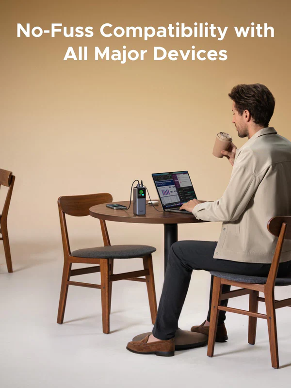 Com uma saída total de 165W, esta bateria externa é capaz de carregar um MacBook Pro e um iPhone à velocidade máxima simultaneamente. O seu design vertical elegante inclui um ecrã digital inteligente que mostra o estado da bateria em tempo real.