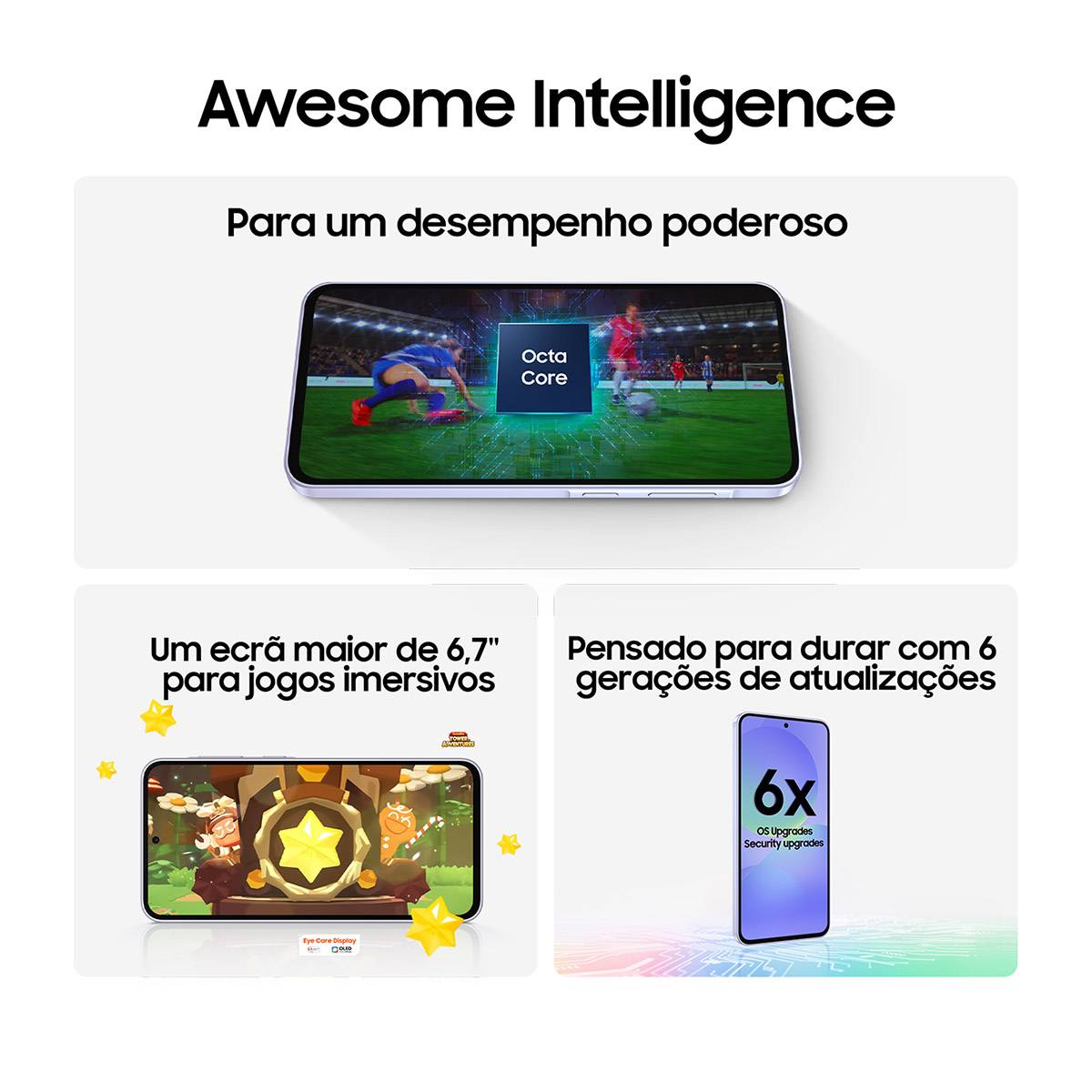 O Galaxy A36 5G suporta redes 5G, assegurando velocidades de download e upload elevadas. Além disso, a Samsung compromete-se a fornecer atualizações de software e segurança durante seis anos, garantindo que o dispositivo se mantém atualizado e seguro ao longo do tempo.